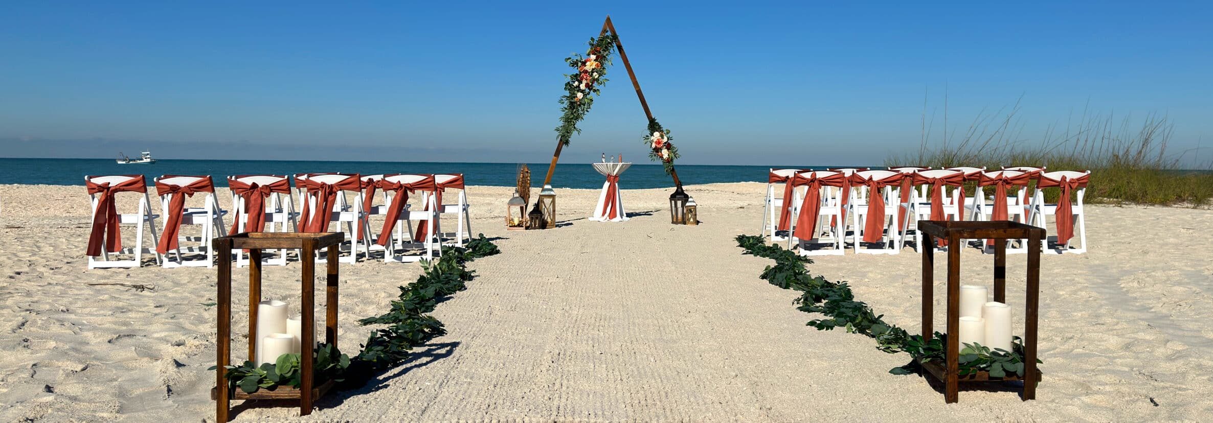 Choose from a variety of all-inclusive beach wedding packages for your wedding, elopement, or vow renewal ceremony in Florida. Florida Sun Weddings has a beach ceremony package for every couple. Once you pick one of our affordable beach wedding packages, you can customize the colors and aisle decor options. When you’re ready, complete our contact form to start planning your beach wedding in Florida.