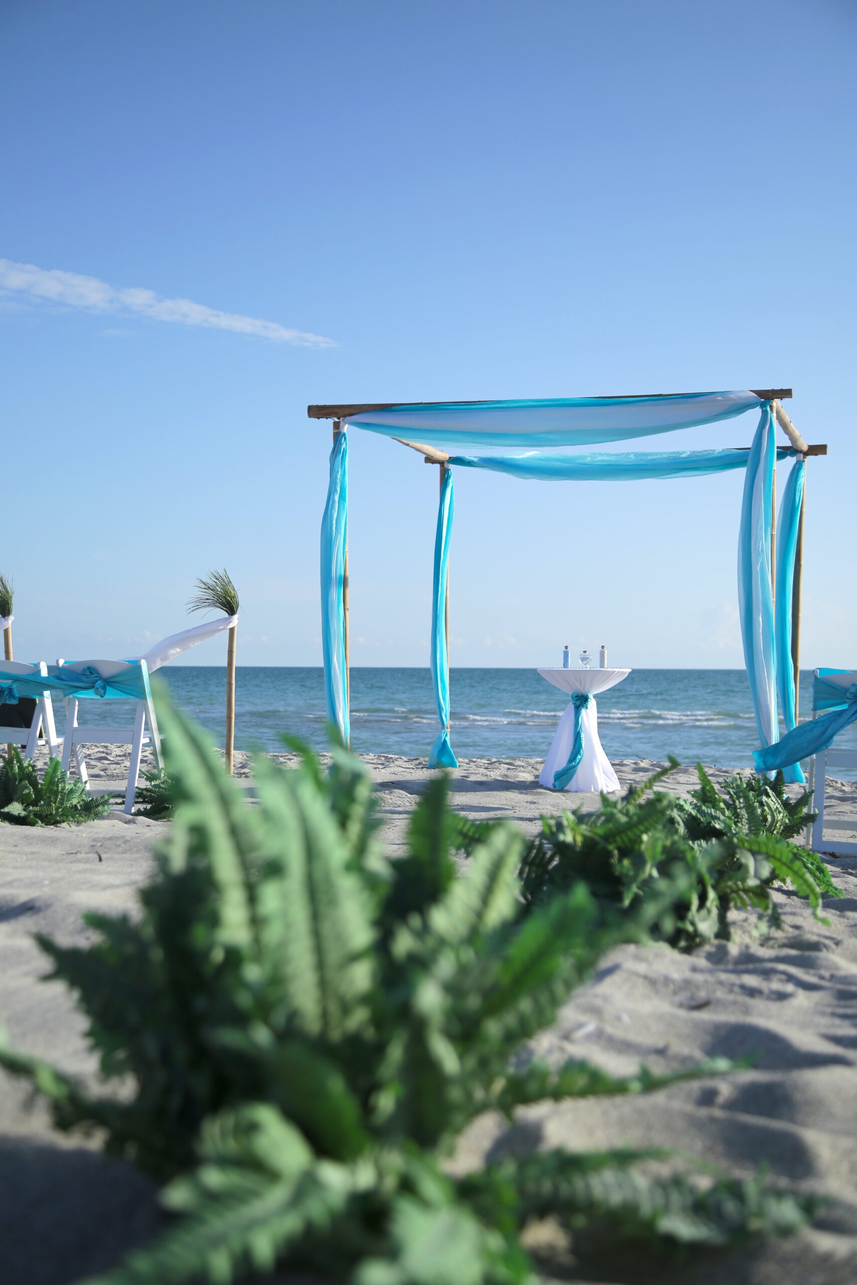 Elevate your Florida beach destination wedding with the captivating charm of our Ocean Waves wedding package, the epitome of customizable ceremony design. This beach ceremony package showcases a spacious 4-post bamboo trellis, elegantly draped in organza in the color of your choosing, paired with 8 bamboo posts adorned with lush greenery.